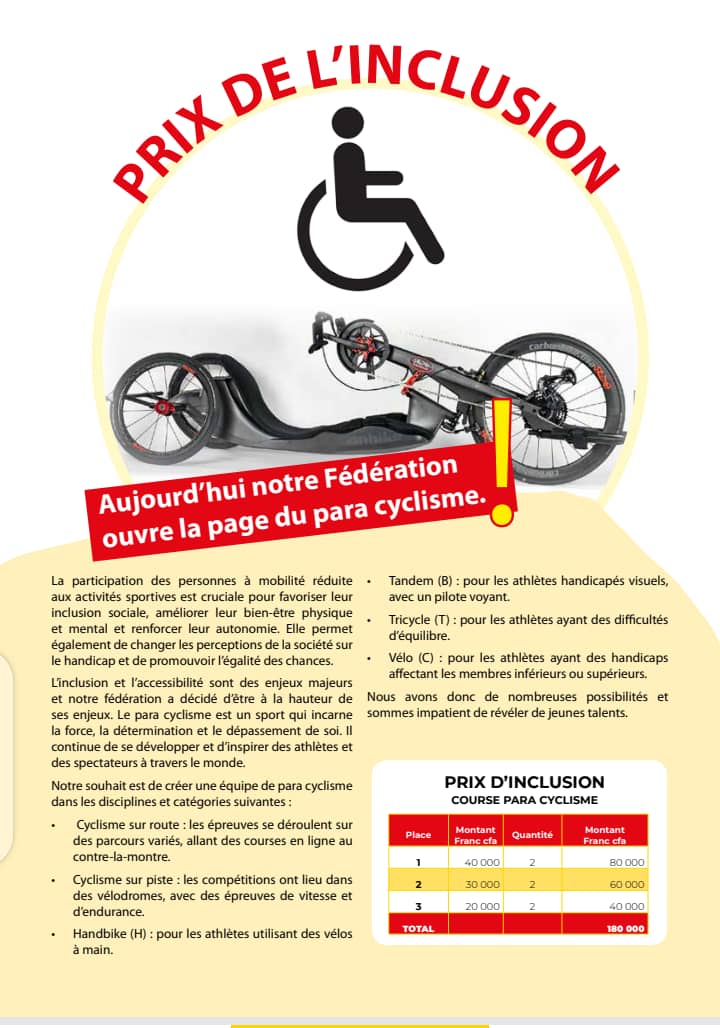 Entre autres, il a évoqué les innovations et particuliers de cette 20ème édition. Inscrit au calendrier de l’Union cycliste internationale (UCI) depuis trois ans, le Tour du Bénin de cette année enregistre trois innovations. La première, l’introduction du paracyclisme prévu pour dimanche 4 mai juste avant le Grand Prix de la ville de Cotonou. M. Hazoumè a précisé que cette course va réunir des athlètes en situation de handicaps dans une compétition en deux phases : la première réservée aux tricycles, la seconde aux fauteuils roulants. « Nous allons faire une course pour les introduire en disant au peuple béninois que ces gens-là, comptent aussi. C’est-à-dire qu’ils peuvent nous apporter beaucoup dans le sport », a-t-il signifié.
