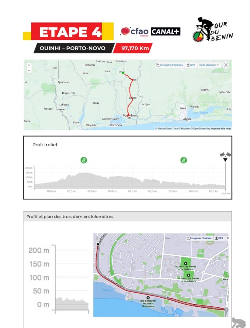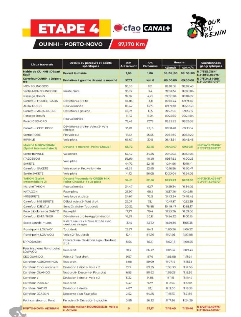 Voir les écarts entre le leader Yoel Habteab et ses concurrents : Lagab Azzedine ( 2′), Sabbah El Houcine ( 5′), El Arbaoui Adil( 6′), Ed Doghmy Achraf ( 7′), El Alouani Driss (12′) , Rahmou Anouar ( 20′) , Mimouni Oussama Abdellah ( 32′) , Beck Jonas (33′) et le camerounais Aurelien Achetkuenyinyi ( 34′) Le coureur érythréen du club allemand Team Bike AID est le maillot jaune avec une avance comprise entre 2′ et 34′ sur neuf coureurs dont cinq marocains Le Tour après trois étapes a connu trois différents vainqueurs : deux algériens et un français. L’algérien Yacine Hamza avait gagné 3 étapes en 2023. En général l’arrivée à Porto-Novo réussit souvent aux coureurs de l’Afrique subsaharienne Le gros défi pour l’Afrique subsaharienne est une victoire d’étape sur cette plus petite distance du parcours (97,170Km) Voir les localités à traverser pour cette 4e étape L’étape du jour présente un relief peu accidenté avec de légères montées. Les 400 derniers mètres où tout va se jouer au sprint présente un terrain plat, après une dernière intercession. La caravane du Tour est en transbordement pour le départ de la 4e Étape.   Le français Victor Lebon a été vainqueur de l’étape 3 à Athiémè. Il a effectué la meilleure arrivée photo pour le moment. Merci de prendre le rendez-vous de l’étape 4 ce vendredi 3 mai 2024. La FBC vous remercie pour l’accompagnement par votre présence sur nos différents canaux
