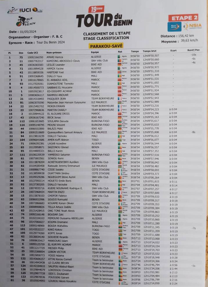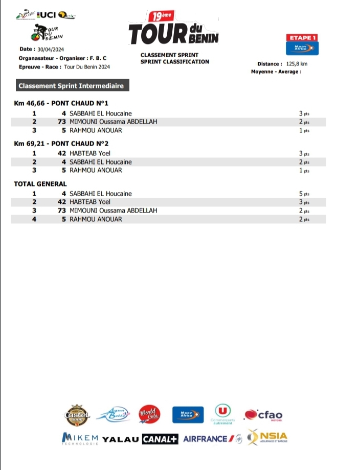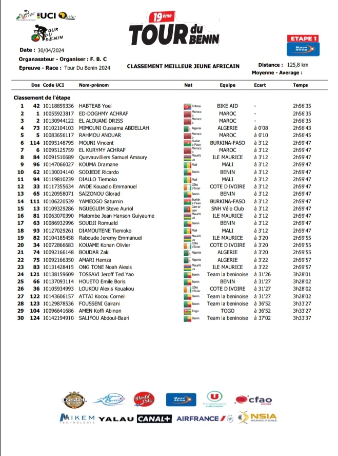 Yoel Habteab, le coureur érythréen de Team Bike AID va porter le maillot jaune ce jeudi 2 avril 2024 avant la 3e étape Djidja-Athiémé (113,800 Km). Il est dans le viseur de 9 coureurs dont un camerounais, 2 algérien, 2 de l’équipe Pro allemande et 5 Marocains.