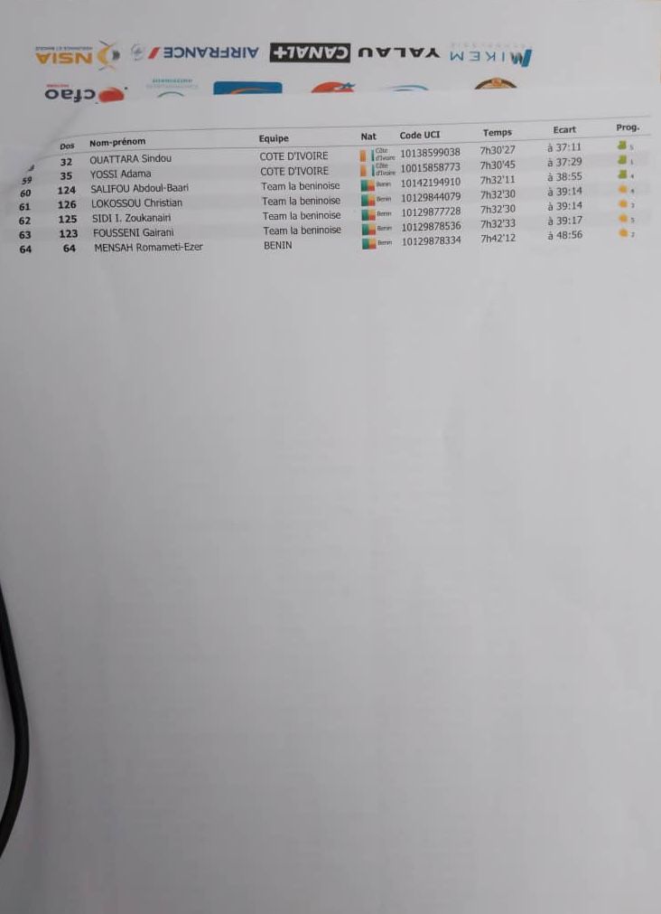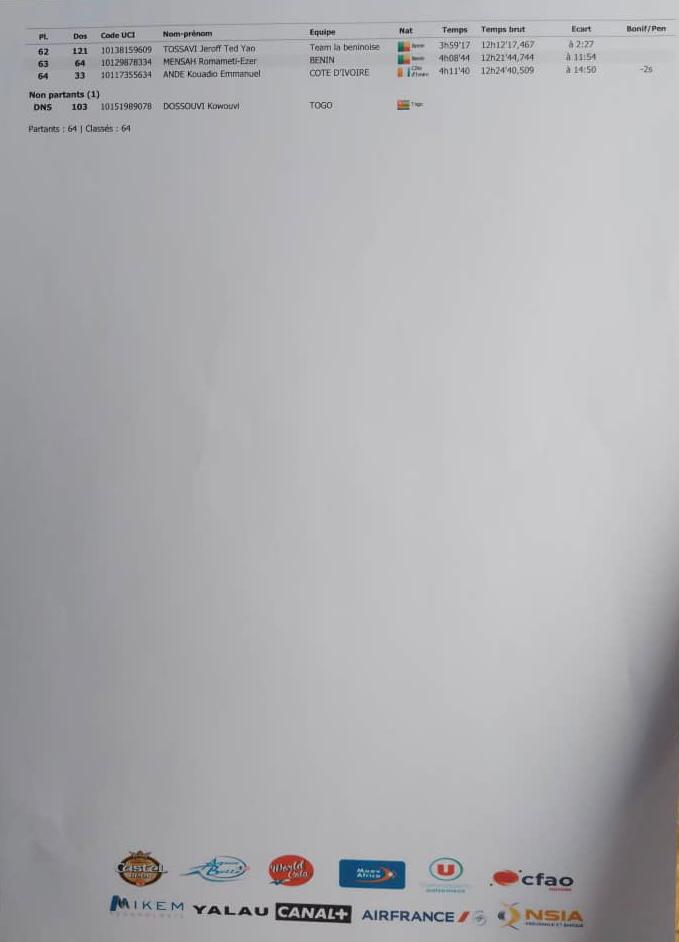 15 26 33 84 113 respectivement Chofor Fabrice (Cameroun 15), Le Clair Bryan (France Team Bon’Heures 26), Ange Kouadio (Côte d’Ivoire 33), Samuel Quevauvilliers (Îles Maurice 84), Wahabou Bouda (Burkina Faso 113)