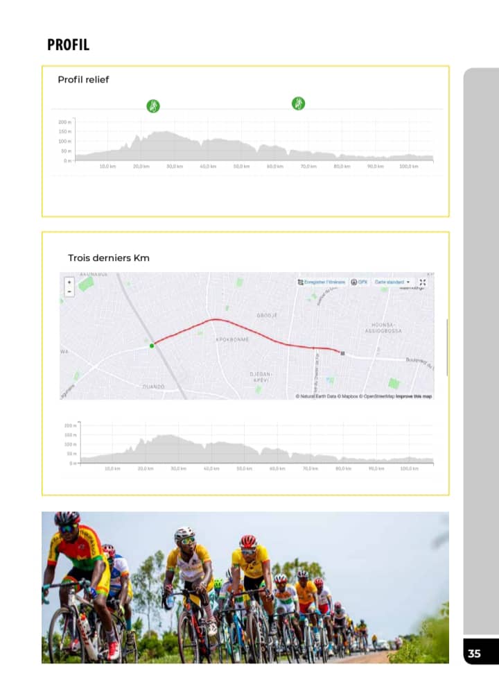 Deux Sprints intermédiaires attendent les coureurs. Le premier au Km 31,94 à hauteur du Marché Mowodani et le deuxième au niveau du Marché Takon- Face dépôt pharmacie