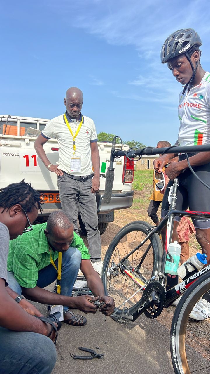 Ennui mécanique d’un coureur ivoirien. Il attend son mécano pour reprendre la course